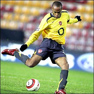 ![]() | The record-breaker Thierry Henry broke the Arsenal goal-scoring record with a brace in Prague after almost two months out with injury. The Frenchman's first was an exquisite, curled effort before he slotted a second - his 186th in Arsenal colours - to surpass Ian Wright's record. "I'm over the moon about the record. To beat Wrighty, an Arsenal legend, is tremendous." |