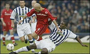 West Brom looked edgy at the start but soon found their composure and began to threaten the visitors' goal. Left wing-back Neil Clement - renowned for his powerful shooting - was heavily involved in his side's threat on the Boro goal. He was just the wrong side of the bar with a 30-yard effort after 10 minutes when Boro failed to clear their lines before seeing keeper Mark Schwarzer parry a well-struck free-kick.