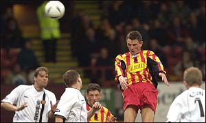 | Saturday, 2 November, 2002, 16:50 GMT Home joy for Thistle ![]() Martin Hardie heads Partick Thistle in front Partick Thistle 2-0 Motherwell E-mail your reaction to Football Talk Partick Thistle picked up their first home win of the season with a comfortable triumph over Motherwell at Firhill. Goals from Martin Hardie and Alex Burns were enough to dump a poor visiting side and see John Lambie's men leapfrog 'Well in the league table. Cold and wet conditions did not make for very entertaining football, but the home side enjoyed the lion's share of possession and created most of the running. Motherwell rallied late in the game but were reduced to ten men when skipper Scott Leitch was dismissed. A hamstring injury meant Thistle's Jamie Mitchell missed out and with Jamie Buchan dropping to the bench, the way was paved for David Lilley and and Scott McLean to return.
