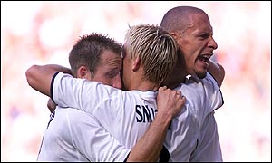 Ferdinand celebrates with former Leeds team-mates Smith and Bowyer
