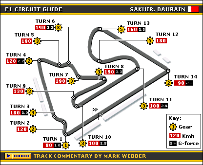 | Location: Manama, Bahrain Date: 6 April Length: 3.366 miles Rating (out of 10): 6 | Bahrain became in 2004 the first country in the Middle East to host a Formula One Grand Prix. That makes it an important event from the commercial point of view, and no expense has been spared with the track. But although it was designed by F1's in-house architect and has superlative facilities, the general view is that it is not a match for Malaysia's Sepang. However, its desert location adds interest, and the track's width and layout encourages lots of overtaking.