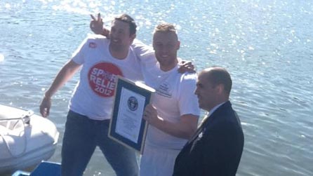 Most cricket deliveries faced in one minute (19); Fastest time to high-five 20 people blindfolded (in 6.53 seconds); Most people popping party poppers (420); Most peas eaten with a cocktail stick in 30 seconds (38); Most kisses in 30 seconds (40); Fastest time to drink a hot chocolate (5.45 seconds); Fastest 100 metres on a pedalo (1 minute 58.62 seconds); Most facebook likes in one hour (52,719); Fastest zorb over 100 metres (26.59 seconds); Fastest 3 point turn in a car (14.01 seconds); Most hot dogs made in 1 minute (9); Hitting the Bullseye from five metres (5.05m).