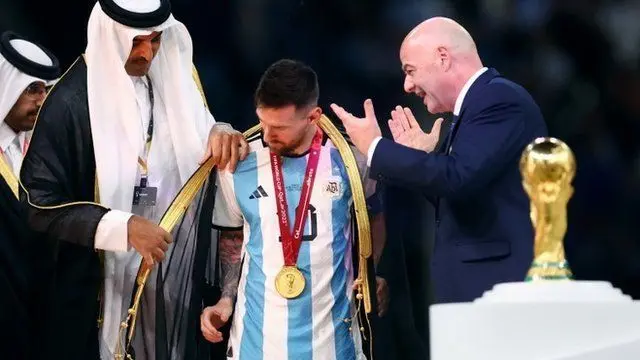 Hapo ndipo emir wa Qatar alipomvalisha Messi katika vazi jeusi na lenye mistari ya rangi ya dhahabu lililokuwa na uwazi. Na kwa vazi hili nyota huyo wa Argentina aliinua kombe hilo pamoja na wachezaji wenzake, akiingizwa kwenye picha ambayo itabaki kuchongwa katika historia ya Argentina na soka la dunia.