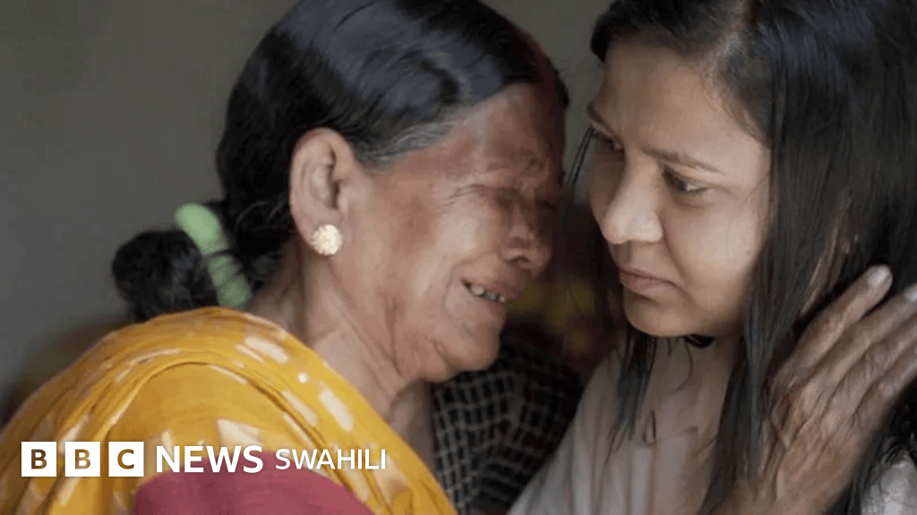 Mkunga Siro Devi anamkumbatia Monica Thatte, huku akilia. Monica, yuko katika miaka yake ya mwisho ya 20, amerejea mahali alipozaliwa huko India ambako Siro amezalisha mamia ya watoto.