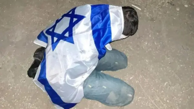 BBC imetathimini picha na video 45, ambazo ni pamoja na zile za wafungwa waliofunikwa bendera za Israel.