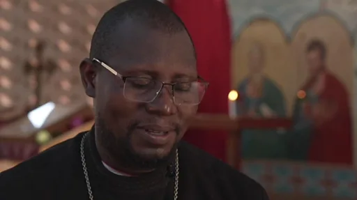 Padri Serguei Voyemawa, kiongozi wa Kanisa pekee la Orthodox la Urusi nchini humo, amevalia vazi jeupe refu lililofunikwa na joho la dhahabu lililopambwa. Anatembea huku na kule akisoma sala na kutikisa kichomea uvumba huku waumini wakifuatilia kila hatua.