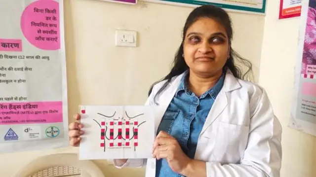 Katika chumba kitupu katika kituo cha afya kinachoendeshwa na serikali huko Vapi, mji ulioko kusini-magharibi mwa jimbo la Gujarat nchini India, Meenakshi Gupta ameshikilia mchoro wa titi la mwanamke huku kanda tano za mwelekeo zenye alama ya Braille zikiwa zimebandikwa juu yake.