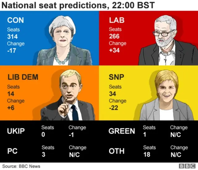 Mhariri wa BBC wa masuala ya kisiasa Laura Kuenssberg, anasema kuwa, ikiwa ubashiri wa matokeo hayo ya baada ya uchaguzi mkuu utathibitishwa kuwa sahihi, Waziri mkuu Bi Theresa May "atakuwa hatarini" alipocheza karata ya kuitisha uchaguzi mkuu wa mapema, ili kuboresha umaarufu wake, lakini itashindwa vibaya.