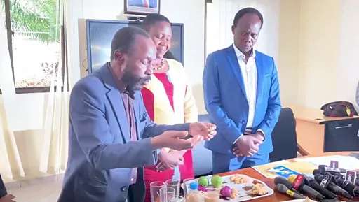 Akiongozana na naibu wake pamoja na mtaalamu wa tiba asili Kutoka NIMR Bi Gwajima ameonyesha jinsi tiba hiyo asili inavyotengezwa kwa kutumia tangawizi, vitunguu, limau na pilipili.