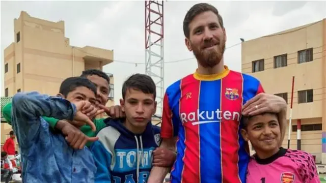 Akiwa amevalia jezi ya Barcelona Battah alicheza soka na watoto hao kwenye uwanja wa mazoezi ulio karibu ,shirika la Reauters lina furaha ya watoto hao kuona jinsi Battah anavyofanana na Messi kwa kutoweza kutofautisha ni kitu 'kisichoweza kuelezeka'.