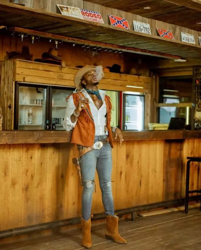 Moja ya matukio ya picha hizo za Diamond ina bendera mbili zilizoonyeshwa wakati akicheza huku akiwa na muonekano wa Cowboy.