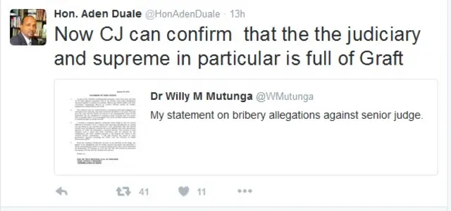 Kiongozi wa Wengi Bungeni, Bw Aden Duale, ambaye ndiye anayewakilisha serikali Bungeni, akichangia kwenye taarifa hiyo aliandika: “Sasa Jaji Mkuu amethibitisha kwamba idara ya mahakama na mahakama ya juu hasa, imejaa ufisadi.”