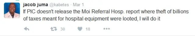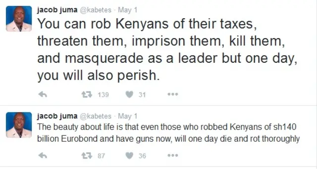 Amekuwa akikosoa sana serikali ya Rais Uhuru Kenyatta na ni mmoja wa waliokuwa wakiishinikiza sana kuhusiana na sakata ya Eurobond.