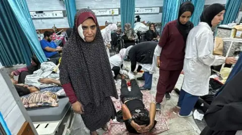 Maelezo ya picha, Wapalestina waliojeruhiwa wakiwa wamelala kwenye vitanda na sakafu katika hospitali ya Kamal Adwan kaskazini mwa Ukanda wa Gaza Mjini Gaza, Wapalestina kadhaa wameuawa na wengine kujeruhiwa alfajiri ya Jumamosi katika shambulio la Israel la mji wa Jabalia kaskazini mwa Ukanda wa Gaza na kambi ya Nuseirat.
