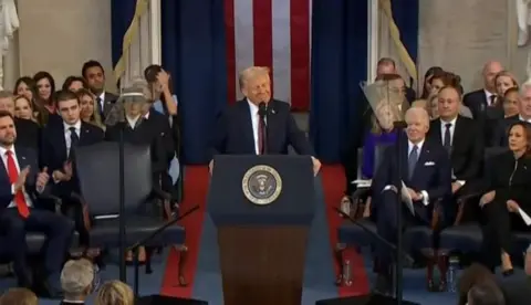 Donald Trump anaanza hotuba yake kama rais kwa kuhutubia marais wenzake na wengine wanaohudhuria hafla hiyo, akiwemo Makamu wa Rais wa zamani Kamala Harris na Rais wa zamani Joe Biden. "Enzi ya dhahabu ya Marekani inaanza hivi sasa," anasema. "Kuanzia leo, nchi yetu itastawi na kuheshimiwa. "Nitaiweka Marekani mbele."