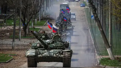 Maelezo ya picha, Vifaru vya urusi Urusi inapanga "kura ya maoni" katika mji wa kusini wa Kherson kwa lengo la kuhalalisha kuuteka mji huo , kulingana na ripoti ya hivi punde ya Wizara ya Ulinzi ya Uingereza.