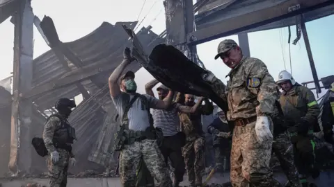 Raia wapatao 1,000 walikadiriwa kuwa ndani ya jumba hilo lenye shughuli nyingi wakati wa shambulio hilo linatokea mwendo wa saa 15:50 (12:50 GMT), Rais Volodymyr Zelensky alisema.