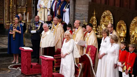Maelezo ya picha, Baada ya Mfalme Charles kutawazwa, mwanawe Mwana Mfalme William alimbusu kwenye shavu Katika Picha: Familia ya kifalme ikifuatilia kutawazwa kwa Mfalme