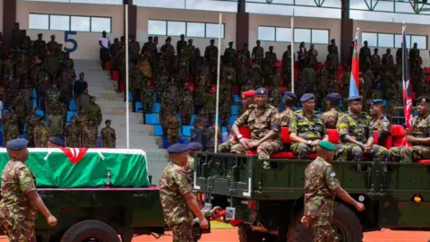 Baada ya ibada hiyo, wanajeshi walisindikiza jenerali wao, kwa gwaride iliyoongozwa na bendi ya mseto ya vikosi vyote vitatu vya kijeshi.