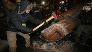 Муътаризон, ки бо пайвастан ба Иттиҳодияи гумрукӣ бо Русия мухолифанд, муҷассамаи Ленин дар Киевро ба пойин кашидаанд ва бо чакуш хурд кардаанд.