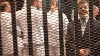Раиси ҷумҳурии пешини Миср дар як қафаси шишаии зидисавтӣ дар додгоҳ ҳузур ёфтааст ва фақат қодир ба шунидани ҷараёни муҳокима аз тариқи гӯшӣ аст ва бо иҷозаи қозӣ метавонад суҳбат кунад.