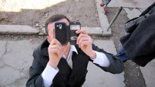Як нафар аз миёни афроди муътариз ба аъзои ҳизби сусиёл-демукрот дар ҳоле ки сурати худро пинҳон медошт, аз ҳама филмбардорӣ мекард