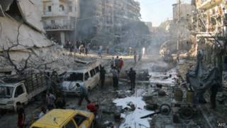 Image copyrightAFPРасонаҳои давлатии Сурия ва фаъъолони мухолифи давлат мегӯянд инфиҷори маҳибе дар Ҳалаб, дар шимоли Сурия, як ҳутел ва чандин сохтмони дигарро нобуд кардааст.