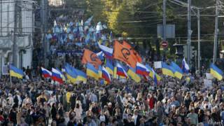 Тазоҳуркунандагон, ки парчамҳои Русия ва Укройнро ҳамл мекарданд аз майдони Пушкин ба хиёбони Сахаров дар маркази Маскав ҳаракат кардаанд.