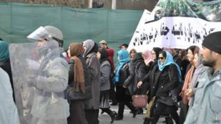 Image copyrightAWNШуморе аз фаъъолони маданӣ ва мудофеъони ҳуқуқи зан бо ширкат дар як роҳпаймоӣ дар Кобул хостори таваҷҷуҳи роҳбарони давлати ваҳдати миллӣ ба саҳми занон дар давлат шуданд.