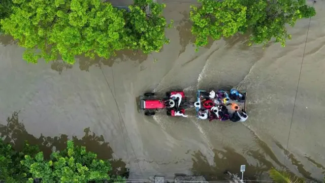 படக்குறிப்பு, சாலைகளில் வெள்ளநீர் சூழ்ந்துள்ளதால் பொதுமக்கள் டிராக்டரில் பாதுகாப்பான இடங்களுக்கு செல்கின்றனர்