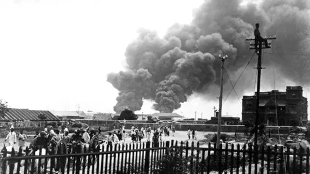 பிரிட்டிஷ் அரசுக்குச் சொந்தமான பர்மா ஆயில் நிறுவனத்தில் 4 டேங்குகளில் இருந்த 3.5 லட்சம் கேலன் கச்சா எண்ணெய் தீப்பிடித்துக் கொண்டது. அதில் இருந்து வானளாவ தீ ஜூவாலைகள் வெளிப்பட்டன. சுற்றியிருந்த பகுதியை கரும்புகை சூழ்ந்தது.