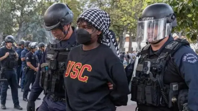கலிபோர்னியாவின் லாஸ் ஏஞ்சல்ஸ் மற்றும் ஜார்ஜியாவின் அட்லாண்டாவில் உள்ள பல்கலைக்கழக வளாகங்களில் போராட்டம் நடத்தியதற்காக மாணவர்கள் கைது செய்யப்பட்டுள்ளனர்.