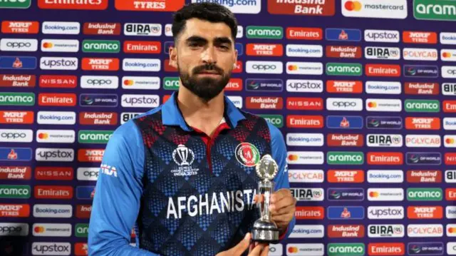 திங்கள் கிழமையன்று பாகிஸ்தானுக்கு எதிரான உலகக் கோப்பை போட்டியில் ஆப்கானிஸ்தான் கிரிக்கெட் வீரர் இப்ராஹிம் ஜாத்ரன் ஆட்ட நாயகனாக தேர்வு செய்யப்பட்டபோது, பாகிஸ்தானில் இருந்து வலுக்கட்டாயமாக திருப்பி அனுப்பப்படும் ஆப்கானிஸ்தான் அகதிகளுக்கு இந்த விருதை அர்ப்பணிப்பதாக கூறினார்.
