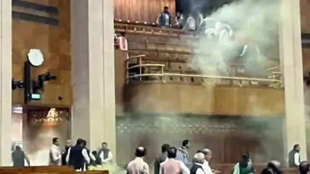 இவர்களில் இருவர் இன்று (புதன்கிழமை) கேள்வி நேரத்தில் அரங்கின் மாடியில் உள்ள பார்வையாளர் கேலரியில் இருந்து கீழே குதித்துள்ளனர். இந்தச் சம்பவம் 2001ஆம் ஆண்டு நாடாளுமன்ற தாக்குதலின் நினைவு நாளில் நடந்துள்ளது.