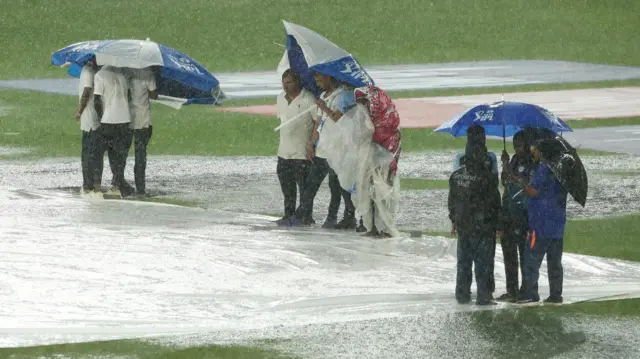பிறகு இரவு 9.30 மணியிலிருந்து மீண்டும் மழை பெய்யத் தொடங்கியதால், ஆடுகளத்தை மூடியிருந்த கவர்களை எடுத்த ஊழியர்கள், ஆடுகளத்தை பாதுகாப்பதற்காக மீண்டும் அந்த கவர்களை கொண்டு மூடும் பணியில் ஈடுபட்டனர்.