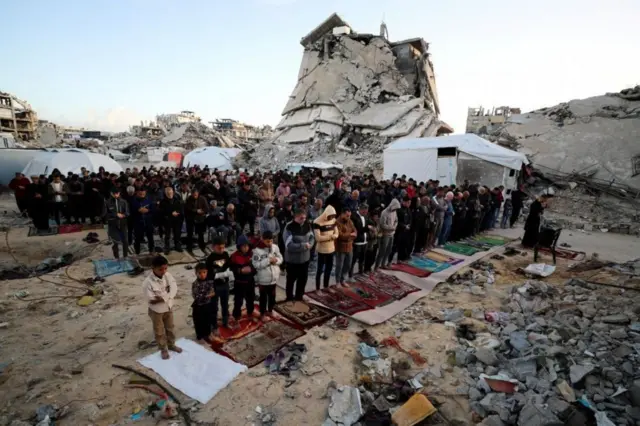 படக்குறிப்பு, வடக்கு காஸா பகுதியில் சேதமடைந்த ஒரு ஒரு மசூதியின் இடிபாடுகளுக்கு மத்தியில் தொழுகை செய்யும் பாலத்தீனர்கள்.