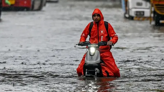 படக்குறிப்பு, மும்பை மாநகரில் கனமழை காரணமாகப் பல்வேறு பகுதிகளில் வெள்ளப்பெருக்கு ஏற்பட்டுள்ளது. வெள்ளத்திற்கு நடுவே உணவு டெலிவரி செய்யும் ஒருவர்