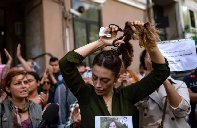 இரானில் ஹிஜாப் ஆடை ஒழுங்குமுறையை அமலாக்கும் காவல்துறையால் கைது செய்யப்பட்ட மாசா அமினி என்ற 22 வயது பெண் செப்டம்பர் 16 அன்று போலீஸ் காவலில் உயிரிழந்தார். போலீஸ் காவலில் இருந்தபோது மாசா அமினி உடல் ரீதியான துன்புறுத்தல்களை எதிர்கொண்டதால் கோமா நிலைக்கு சென்றதாக நேரடி சாட்சியங்கள் கூறுகின்றன. இதைத்தொடர்ந்து இரானில் பெரும்பாலான பெண்கள் தங்கள் முடியை வெட்டி இரான் அரசுக்கு எதிரான தங்கள் எதிர்ப்பைப் பதிவு செய்தனர். படத்தில் இருப்பவர் துருக்கியில் வாழ்ந்துவரும் இரான் பெண் நசிபே சம்சேய். இரானில் பெண்களின் போராட்டத்திற்கு ஆதரவாக இஸ்தான்புல்லில் உள்ள இரான் தூதரகம் முன்பு தன் முடியை வெட்டி எதிர்ப்பைப் பதிவு செய்த இந்த புகைப்படம் அச்சமயத்தில் வைரலானது.