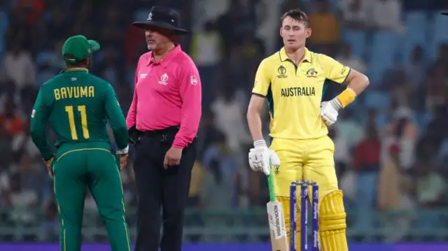 விக்கெட்டுகள் வீழ்ந்தாலும் லாபுஷேன் மட்டும் நிதானமாக பேட் செய்தார், அடுத்து வந்த ஸ்டாய்னிஷ் தன்னை நிலைப்படுத்துவதற்குள் ரபாடாவின் பந்துவீச்சில் வீழ்ந்தார். ரபாடா வீசிய 18-வது ஓவரில் ஸ்டாய்னிஷ் அடித்த ஷாட்டை விக்கெட் கீப்பர் டீ காக் கேட்ச் பிடித்து அவுட் என நடுவரிடம் முறையிட்டார். ஆனால், நடுவர் அவுட் வழங்கவில்லை. ஆனால், ஸ்டாய்னிஷ் தொடையில் பந்துபட்டு, அவரின் பேட் ஹேன்டிலில் பட்டு சென்றது என டீ காக் தெரிவித்தார். இதையடுத்து, 3வது நடுவரிடம் கேப்டன் பவுமா அப்பீல் செய்தார்.