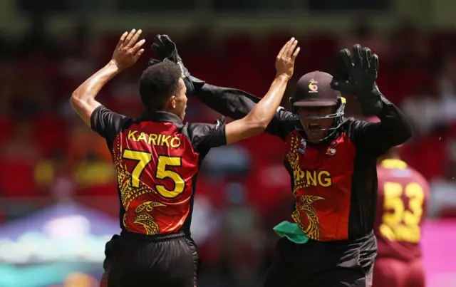 அதிலும் பிஎன்ஜி பந்துவீச்சாளர் அலி நாவோ உலகக் கோப்பையில் தனது முதல் ஓவர் முதல் பந்தை வீசியபோது, மேற்கிந்தியத்தீவுகள் பேட்டர் சார்லஸ் தேவையின்றி கால்காப்பில் வாங்கி ஆட்டமிழந்தார். சார்லஸ் அடித்த ஷாட் தேவையில்லாதது, பிரண்ட்ஃபுட் வைத்து ஆட வேண்டிய ஷாட்டை கால்காப்பி்ல் வாங்கி வெளியேறினார்.