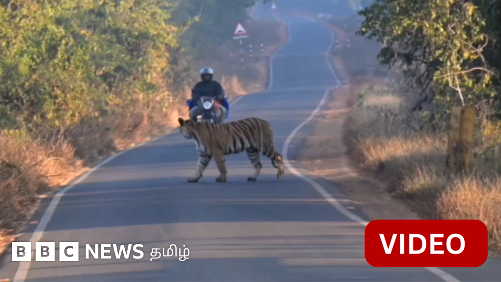 காணொளி: சாலையில் இருசக்கர வாகன ஓட்டிக்கு குறுக்கே திடீரென வந்த புலி