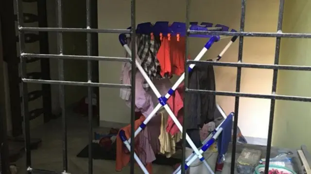 அந்த அறையின் உள்ளே ஒரு மேஜையில் வாசனைக்காக ஒரு கிண்ணமும் வண்ணப் பெட்டியும் இருந்தது. ஒரு மெத்தை தரையில் கிடந்தது. உள்ளே இன்னொரு அறை தெரிந்தது, ஆனால் அங்கே எல்லாம் சிதறிக் கிடந்தது.