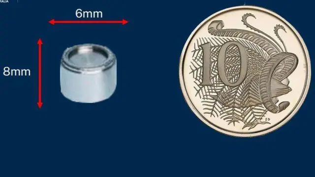 காணாமல் போன கதிரியக்க குடுவை, சுமார் 6 மில்லி மீட்டர்- 8 மில்லி மீட்டர் அளவே இருக்கும். இதை விளக்கும் வகையில் ஒரு படத்தை ஆஸ்திரேலிய தீயணைப்பு மற்றும் அவசர சேவைகள் துறை வெளியிட்டுள்ளது.