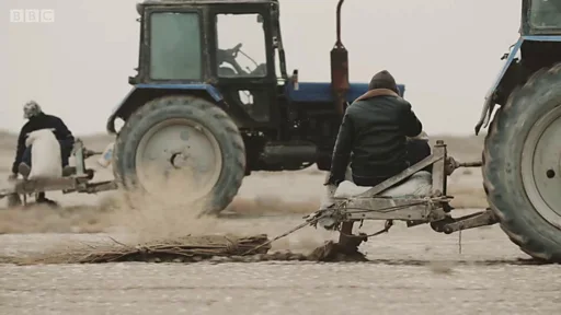 மெலிதான அகழிகள் கடற்படுகைகளில் வெட்டப்பட்டுள்ளன. டிராக்டர்களில் அமர்ந்து விதைகளை அந்த அகழிகளில் தூவுகிறார்கள் அந்த இளைஞர்கள்.