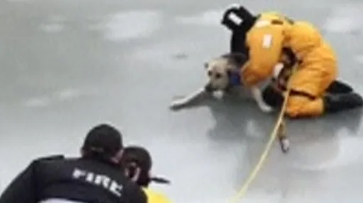 உறைந்த பனி கட்டியிலிருந்து நாயை மீட்கும் தீயணைப்பு வீரர்