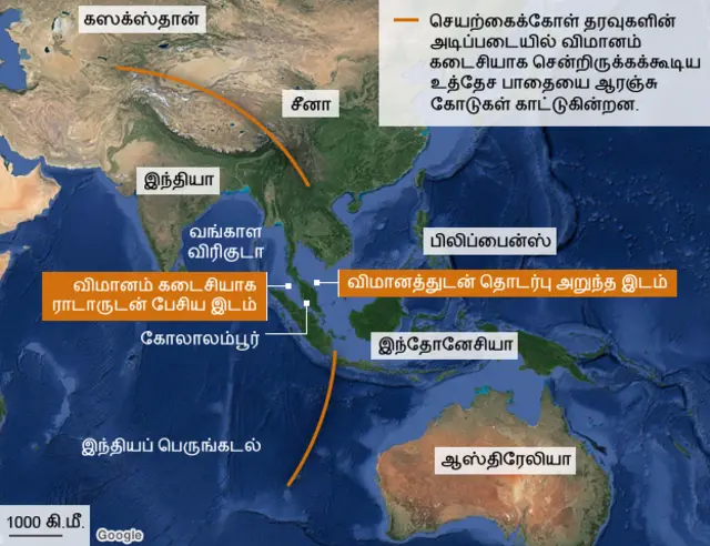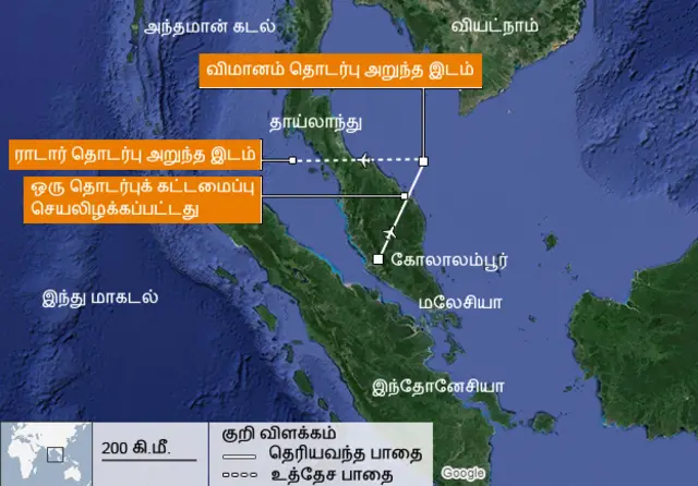 <link type="page"><caption> விமானத்துடன் ராடார் தொடர்பு அறுந்த இடத்தையும், அது சென்றிருக்கக்கூடிய பாதையையும் காட்டும் வரைபடங்கள்</caption><url href="#1" platform="highweb"/></link>