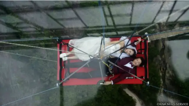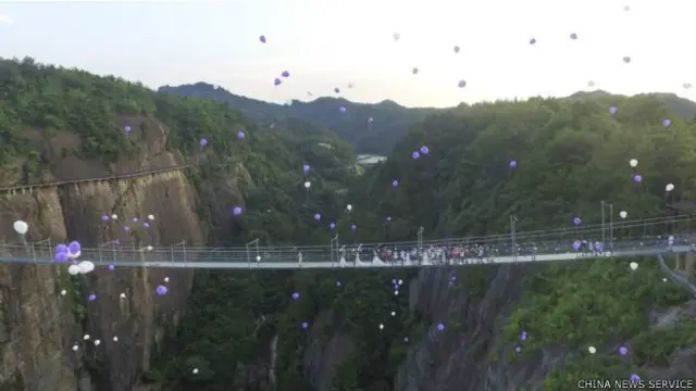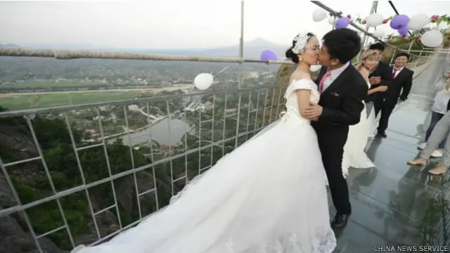 ஹுனான் மாகாணம் பிங்ஜாங்கில் உள்ள உலகின் நீளமானதாகவும், திகிலூட்டக்கூடியதுமாக கருதப்படும் ஷின்ஜுசாய் கண்ணாடி பாலத்தில், சீன காதலர் தினமான ஆகஸ்டு 9 ஆம் நாள் இந்த மணமகளும் மணமகனும் திருமணம் செய்து கொண்டனர்.