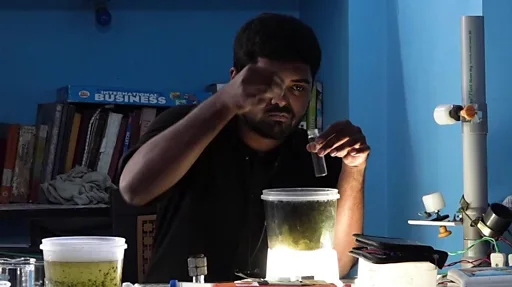 "நன்னீர் குளங்கள், வெள்ளார் கழிமுகம், கடல்நீர் என்று பல இடங்களில் இருந்து சேகரித்துக் கொண்டு வந்த நுண்ணுயிரிகளை வீட்டிலேயே வளர்க்க முடிவெடுத்தேன். மனிதர்களுக்குத் தேவைப்படும் ஊட்டச்சத்துகளைப் போலவே, அவற்றுக்கும் உயிர்பிழைத்திருக்க ஊட்டச்சத்துகள் தேவை. அதனால், முட்டையின் மஞ்சள் கருவைப் பொடியாக்கி அவற்றுக்குத் தூவிவிடுவேன். அதைப் போல, வெங்காயம், தக்காளி போன்றவற்றின் கழிவுகளை மிகவும் நுண்ணிய அளவில் கொடுப்பேன்.