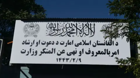 ஆப்கானிஸ்தானில் பெண்கள் விவகாரத் துறை அமைச்சகத்தின் பலகையை நீக்கிவிட்டு, அதற்கு பதிலாக மத கோட்பாடுகளை வலியுறுத்தும் அமைப்பின் பலகையை தாலிபன்கள் வைத்துள்ளனர்.
