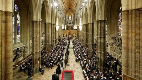 முன்னதாக, ராணியின் உடலுடன் புறப்பட்ட இறுதி ஊர்வலம் முதலாவதாக வெஸ்ட்மின்ஸ்டர் அபேவில் நின்றது. அங்கு ஆயிரக்கணக்கான மக்கள் கலந்து கொள்ளும் மதக் கூட்டம் நடைபெற்றது.